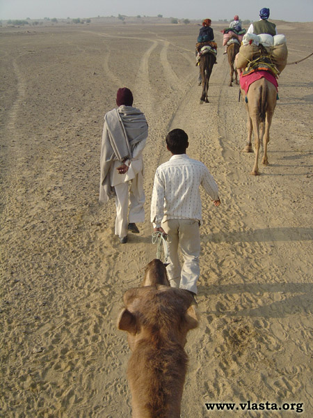Asi po hodině jízdy přesedáme na velbloudy. Klientů nás je pět (minimální počet pro realizaci výletu jsou dva). Každý máme svého velblouda. Můj se jmenuje Naďa ;) Nevím, jak dostal zrovna takovéto jméno. Doprovází nás tři průvodci. Thárská poušť zde je docela pestrá. Nejde o tak písečnou poušť jako je např. Sahara. Každou chvilku se mění vegetace. Občas poletuje nějaký ptáček. Zahlédl jsem dokonce srnky. Tak ty bych v poušti opravdu nečekal... Asi po dvou hodinách zastavuje ve stínu křovisek. Hoch z nedaleké osady zde pase kozy. Naši průvodci velbloudy odstojí a svážou přední nohy tak, aby se mohli pohybovat ale neutekly. Pak se hned dávají do přípravy oběda. Oběd připravují na otevřeném ohni. Zde v poušti jsem neočekával žádnou dobrotu, ale jídlo bylo velice chutné. Chutnalo jak v lepší restauraci ve městě. Na oběd k nám přijeli ještě další dva jezdci na velbloudech. Až později sjem zjistil, že ti sloužili jako průvodci skupince, která měla program začínající až odpoledne.