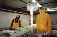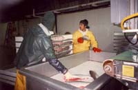 Hned druhý den po příjezdu do rybárny jsme začali pracovat. Celý pracovní proces je zde rozdělen do třech oddělení. Butchreing - zde se ryby zabíjejí a vykuchají. Dalším oddělením je Grading - kde se ryby třídí podle jakosti a váhy a pak se dají na pár hodin zmrazit. Posledním oddělením je Case Up. V tomto oddělní se zmražení salmoni jednotlivě balí do pytlíkových sáčku a pak dávají do krabic. Takto jsou pak připraveny na export do Japonska.